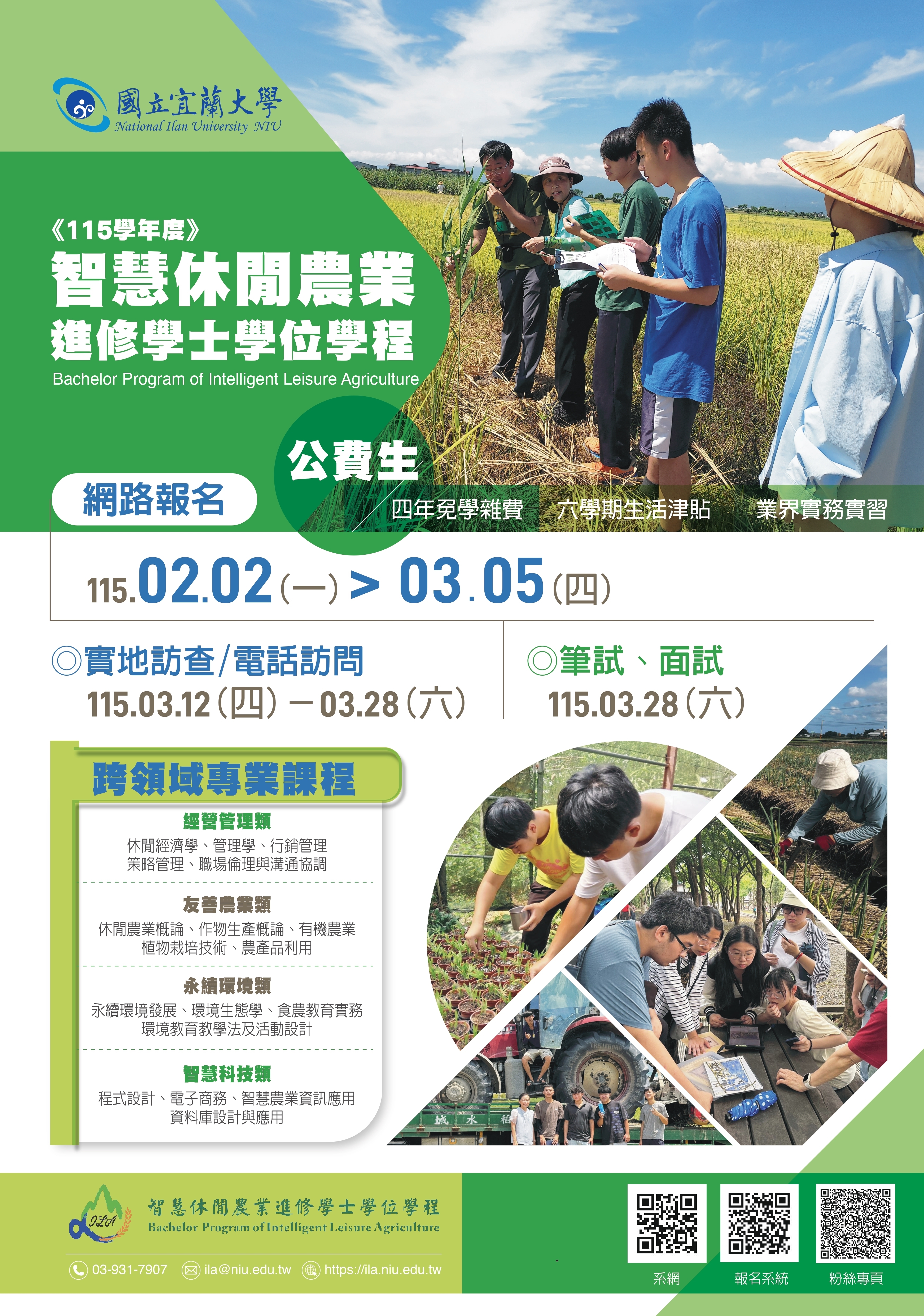 一、本校114學年度智慧休閒農業進修學士學位學程招生,自115年2月2日(一)至115年3月5日(四)受理網路報名,有意報考者請詳閱本校115學年度智慧休閒農業進修學士學位學程招生簡章或電洽:03-9317285、03-9317907。
